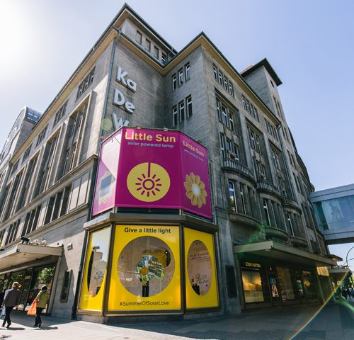 Posted inBlog, Humanitarian Work, Off GridA big highlight of Little Sun’s 2015 #SummerOfSolarLove campaign was being so beautifully and prominently presented by KaDeWe, one of Germany’s best-loved department stores. Throughout June 2015, the iconic store featured a Little Sun window display on Berlin’s shopping boulevard, the Ku’Damm, as well as featuring the lamps within KaDeWe in a colourful pop-up shop. […]